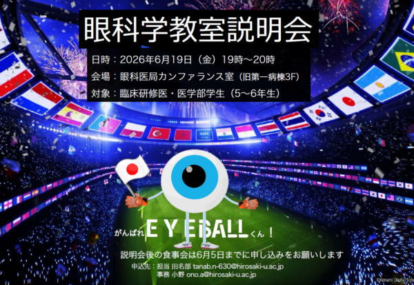 6月19日(金)、新臨床研究棟3階(旧第一病棟3階)眼科医局カンファレンス室にて説明会を行います。